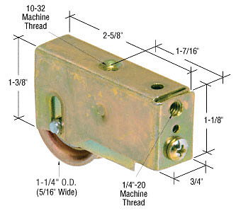 This CRL Sliding Glass Door Ball Bearing Roller Assembly has an adjustable steel housing which is 3/4" (19 mm) wide and 1-3/8" (35 mm) tall. It has a 1-1/4" (31.7 mm) diameter steel wheel and is used by many patio door manufacturers. Each package contains one roller assembly.