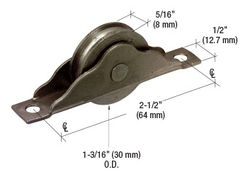 This CRL Sliding Door Roller has a single, 1-3/16" (30 mm) diameter steel concave ball bearing roller with solid axle. The housing is 1/2" (12.7 mm) wide with screw holes 2-1/2" (64 mm) on center. It fits a 2-15/16" x 1/2" (74.6 x 12.7 mm) mortise slot in the door rail. Two rollers per package.