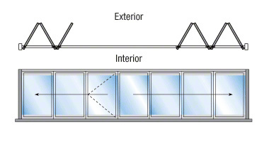 Our Monterey Series Bi-Folding Sliding Door System can accommodate door configurations ranging from 2 to 26 panels and allows them to be stacked with minimum effort to one or both sides, leaving an enormous wide open space. A pivoting door, that will also fold up with the entire system, can be incorporated into many configurations. Design options are virtually limitless. The sturdy, yet slim frame construction allows for more glass and less metal. The Monterey Series is designed for 1/4" to 1-1/4" (6 to 32 mm) glazing thickness, and the frames are available in white, black, and wood grain powder coated, satin and black bronze anodized finishes as standard with custom finishes also available.