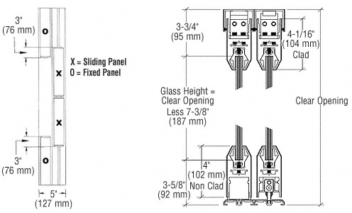 The CRL SDR Bottom Rolling Sliding Door System with 4" (102 mm) Tapered Rails Top and Bottom utilizes our popular Wedge-Lock® Glass Securing System. The DR4T Series Door Rails are used for all door and fixed panels, and are custom fabricated to your specifications. The doors can be ordered with or without locks in the bottom rail. Maximum door width is 48" (1.22 m); maximum door height is 108" (2.74 m), with a maximum weight not to exceed 234 pounds (106 kg).