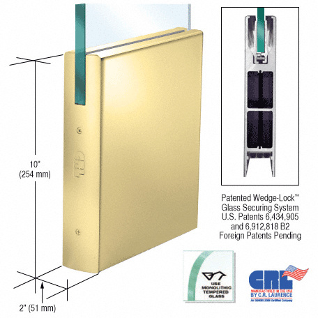 CRL Wedge-Lock® Door Rail System features the exclusive CRL Wedge-Lock® Securing System (U.S. Patents 6,434,905 and 6,912,818 B2, Canadian Patent 2,419,706, and European Patent No. EP 1 404 939 B1). A concept for securing the glass in the door rail. It works by applying pressure from the bottom of the door rail, using two glass retaining aluminum extrusions via a flat stainless steel bar. As this bar is pulled down with socket head cap bolts, pressure is applied to the glass retaining aluminum extrusions. The bottom of the extrusions are at an angle and fit into an angled groove in the door rail. As the glass retaining extrusions are being pulled down, the angled wedge in the door rail also pulls the glass retaining extrusions together. This action, along with our specially designed door retaining gasket, creates a tremendous amount of force (more than 900 lbs.) in our 9" (228.6 mm) Corner Rail. That's 100 lbs. per inch. Imagine how much force is created in our full length 35-3/4" (908 mm) Door Rails!