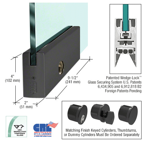 CRL Wedge-Lock® Door Rail System features the exclusive CRL Wedge-Lock® Securing System (U.S. Patents 6,434,905 and 6,912,818 B2, Canadian Patent 2,419,706, and European Patent No. EP 1 404 939 B1). A totally new concept for securing the glass in the door rail. It works by applying pressure from the bottom of the door rail, using two glass retaining aluminum extrusions via a flat stainless steel bar. As this bar is pulled down with socket head cap bolts, pressure is applied to the glass retaining aluminum extrusions. The bottom of the extrusions are at an angle and fit into an angled groove in the door rail. As the glass retaining extrusions are being pulled down, the angled wedge in the door rail also pulls the glass retaining extrusions together. This action, along with our specially designed door retaining gasket, creates a tremendous amount of force (more than 900 lbs.) in our 9" (228.6 mm) Corner Rail. That's 100 lbs. per inch. Imagine how much force is created in our full length 35-3/4" (908 mm) Door Rails!