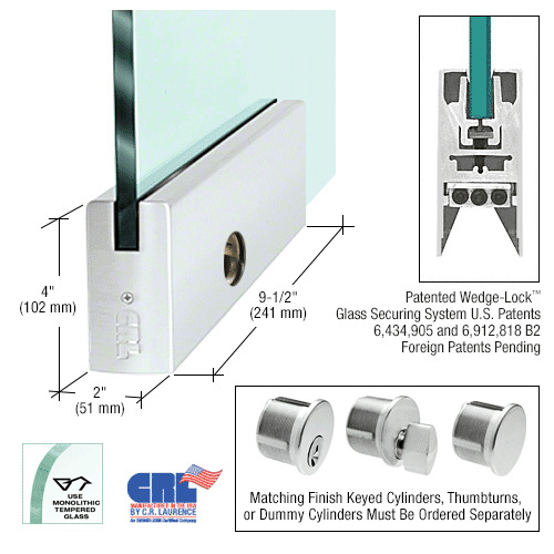 CRL Wedge-Lock® Door Rail System features the exclusive CRL Wedge-Lock® Securing System (U.S. Patents 6,434,905 and 6,912,818 B2, Canadian Patent 2,419,706, and European Patent No. EP 1 404 939 B1). A totally new concept for securing the glass in the door rail. It works by applying pressure from the bottom of the door rail, using two glass retaining aluminum extrusions via a flat stainless steel bar. As this bar is pulled down with socket head cap bolts, pressure is applied to the glass retaining aluminum extrusions. The bottom of the extrusions are at an angle and fit into an angled groove in the door rail. As the glass retaining extrusions are being pulled down, the angled wedge in the door rail also pulls the glass retaining extrusions together. This action, along with our specially designed door retaining gasket, creates a tremendous amount of force (more than 900 lbs.) in our 9" (228.6 mm) Corner Rail. That's 100 lbs. per inch. Imagine how much force is created in our full length 35-3/4" (908 mm) Door Rails!