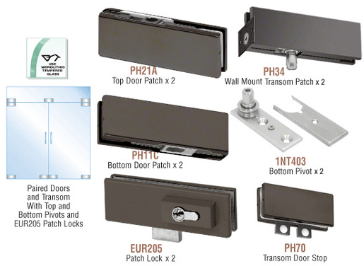 CRL PHE6 European Double Door Kits come with all the hardware to complete a pair of free-swinging doors with fixed transom, (except glass and additional supports for the fixed transom). Pivot setback is 2-9/16" (65 mm). Floor closer with tapered spindle (ordered separately) may be used with this Kit.