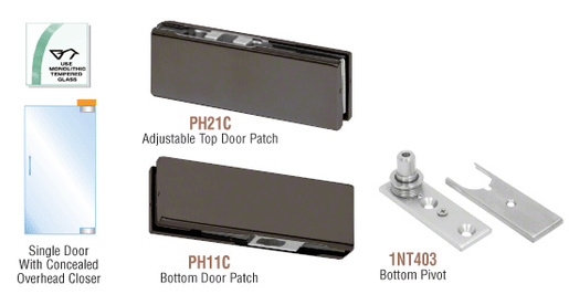CRL PHE2 European Patch Door Kits come with all the hardware to complete a single door (except the overhead closer and glass). Pivot setback is 2-9/16" (65 mm). The Top Patch Fitting (PH21C) is adjustable after the door is installed. Overhead door closer must be ordered separately.