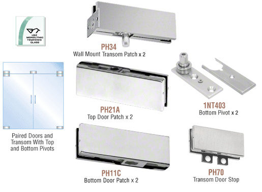 CRL PHE6 European Double Door Kits come with all the hardware to complete a pair of free-swinging doors with fixed transom, (except glass and additional supports for the fixed transom). Pivot setback is 2-9/16" (65 mm). Floor closer with tapered spindle (ordered separately) may be used with this Kit.