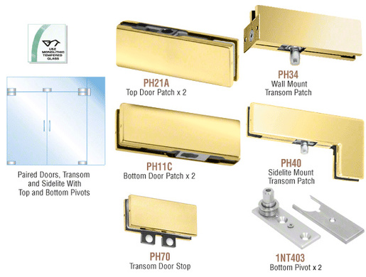 CRL Polished Brass European Patch Door Kit for Double Doors for Use with Fixed Transom and One Sidelite - Without Lock Stock