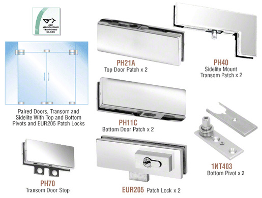 CRL PHE8 European Double Door Kits come with all the hardware to complete a pair of free-swinging doors with fixed transom and two sidelites, (except glass and additional supports for the fixed transom and sidelites). Pivot setback is 2-9/16" (65 mm). Floor closer with tapered spindle (ordered separately) may be used with this Kit.