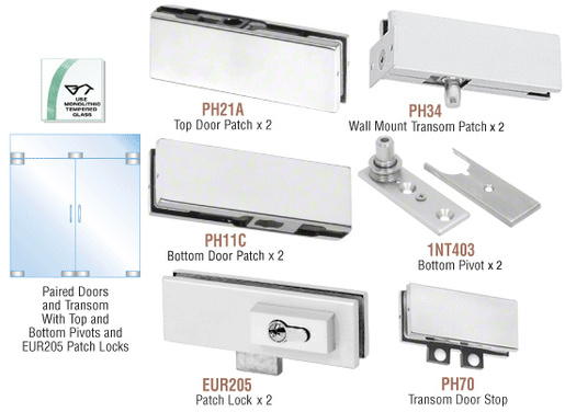 CRL PHE6 European Double Door Kits come with all the hardware to complete a pair of free-swinging doors with fixed transom, (except glass and additional supports for the fixed transom). Pivot setback is 2-9/16" (65 mm). Floor closer with tapered spindle (ordered separately) may be used with this Kit.