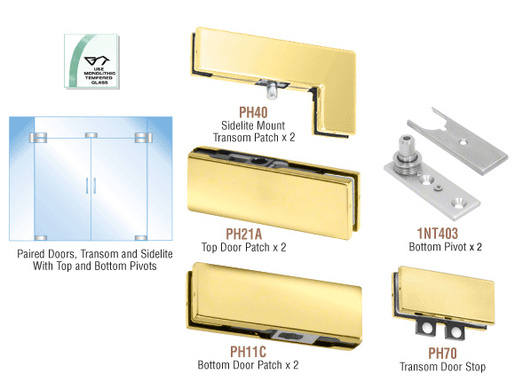 CRL PHE8 European Double Door Kits come with all the hardware to complete a pair of free-swinging doors with fixed transom and two sidelites, (except glass and additional supports for the fixed transom and sidelites). Pivot setback is 2-9/16" (65 mm). Floor closer with tapered spindle (ordered separately) may be used with this Kit.
