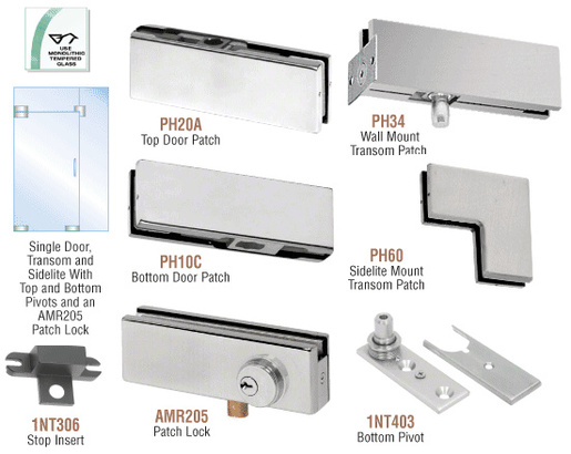 CRL PHA4 North American Door Kits come with all the hardware to complete a free-swinging door with fixed transom and sidelite, (except glass and additional supports for the fixed transom and sidelite). Pivot setback is 2-3/4" (70 mm). Floor closer with tapered spindle (ordered separately) may be used with this Kit.