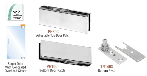 CRL PHA2 North American Patch Door Kits come with all the hardware to complete a single door (except the overhead closer and glass). Pivot setback is 2-3/4" (70 mm). The Top Patch Fitting (Cat. No. PH20C) is adjustable after the door is installed. Overhead door closer must be ordered separately.