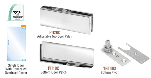 CRL PHA2 North American Patch Door Kits come with all the hardware to complete a single door (except the overhead closer and glass). Pivot setback is 2-3/4" (70 mm). The Top Patch Fitting (Cat. No. PH20C) is adjustable after the door is installed. Overhead door closer must be ordered separately.