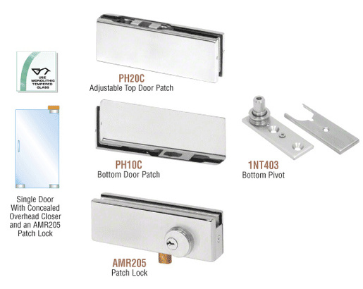 CRL PHA2 North American Patch Door Kits come with all the hardware to complete a single door (except the overhead closer and glass). Pivot setback is 2-3/4" (70 mm). The Top Patch Fitting (Cat. No. PH20C) is adjustable after the door is installed. Overhead door closer must be ordered separately.