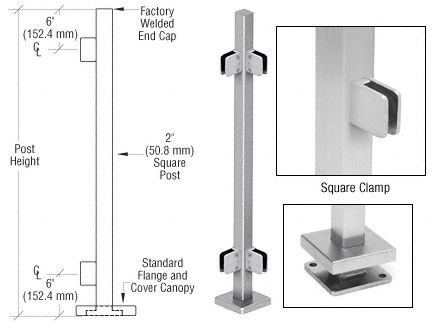 CRL's Glass Clamp Square Post Kits are manufactured from Schedule 40 2" (51 mm) Stainless Steel Tubing. Kits are supplied complete with a Base Plate, Base Plate Cover Canopy, Welded Top Cap, and Z-Series Glass Clamps factory attached to the Post.
