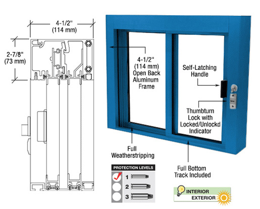 Today's market is looking for night time protection, but daytime "business as usual" CRL Bullet Resistant Sliding Service Windows to conduct transactions. These windows can be used opened during daytime business hours, and used closed at night, when most crimes are committed. This high quality window can be fabricated to accommodate most installations. Level One Bullet resistant protection is provided with the 3/4" (19 mm) Laminated Polycarbonate Level 1 glazing and the window in the closed position.
