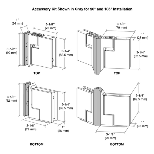 The <b>CRL Zero Hinge Accessory Kit</b> includes a set of clamping plates for installation as a 90° glass-to-glass application & a set of central wedges for installation as a 135° glass-to-glass application.
