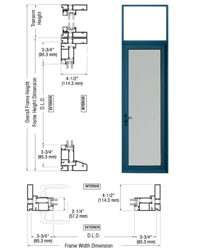 The CRL Series 900 Terrace Door is a custom thermally broken entrance built with a 1" x 4-1/2" x 120" (25 mm x 114 mm x 3.05 m) transom frame, a medium stile 2-1/4" (57 mm) thick door with 3-3/4" (95 mm) stiles, 1-1/2 pair of offset adjustable pivot hinges, a 3-3/4" (95 mm) top rail, and a 3-3/4" (95 mm) bottom rail. Standard features include a five-point locking device and a standard matching finish aluminum threshold.