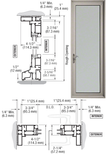 This CRL Series 900 Terrace Door Entrance is built with 1" x 4-1/2" (25 x 114.3 mm) Frame, 2-1/4" (57.2 mm) Thick Door, 3.75" (95 mm) Stiles, 3.75" (95 mm) Top Rail, and 3.75" (95 mm) Bottom Rail. Standard features include stiles for Butt Hinge hardware, glass stops for 1" (25 mm) tempered glass (by others), and Five-Point Locking Hardware.