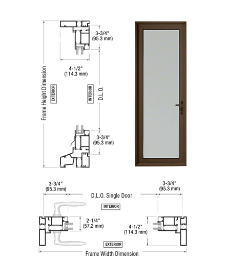 The CRL Series 900 Terrace Door is a custom thermally broken entrance built with a 1" x 4-1/2" (25 x 114 mm) frame, a medium stile 2-1/4" (57 mm) thick door with 3-3/4" (95 mm) stiles, 1-1/2 pair of offset adjustable pivot hinges, a 3-3/4" (95 mm) top rail, and a 3-3/4" (95 mm) bottom rail. Standard features include a five-point locking device and a standard matching finish aluminum threshold.