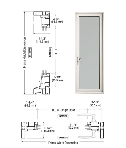 The CRL Series 900 Terrace Door is a custom thermally broken entrance built with a 1" x 4-1/2" (25 x 114 mm) frame, a medium stile 2-1/4" (57 mm) thick door with 3-3/4" (95 mm) stiles, 1-1/2 pair of offset adjustable pivot hinges, a 3-3/4" (95 mm) top rail, and a 3-3/4" (95 mm) bottom rail. Standard features include a five-point locking device and a standard matching finish aluminum threshold.