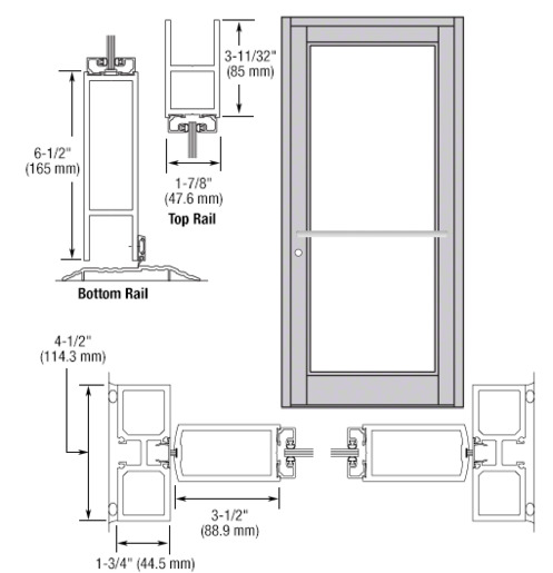 This Custom Durafront MS Entrance Door is built with 3-1/2" (89 mm) Stiles, 3-11/32" (85 mm) Top Rail, and 6-1/2" (165 mm) Bottom Rail. Standard features include stiles for Center Pivot hardware, glass stops for 1/4” (6 mm) tempered glass (by others), ready for custom fabrication for a wide range of optional hardware applications.