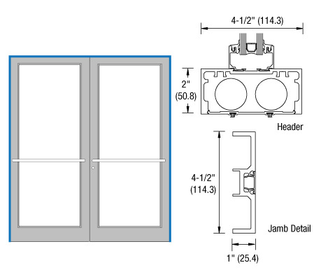 CRL Complete Frame is built to accommodate a custom sized pair of Durafront Doors that are center hung for use with an overhead concealed door closer. Constructed using TJ455/P050 Open Back Jambs with 1G457/P427 Header with weatherstrip, standard hardware, and included hardware preparations.