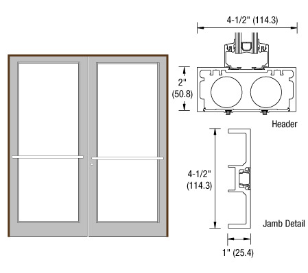 CRL Complete Frame is built to accommodate a custom sized pair of Durafront Doors that are center hung for use with an overhead concealed door closer. Constructed using TJ455/P050 Open Back Jambs with 1G457/P427 Header with weatherstrip, standard hardware, and included hardware preparations.
